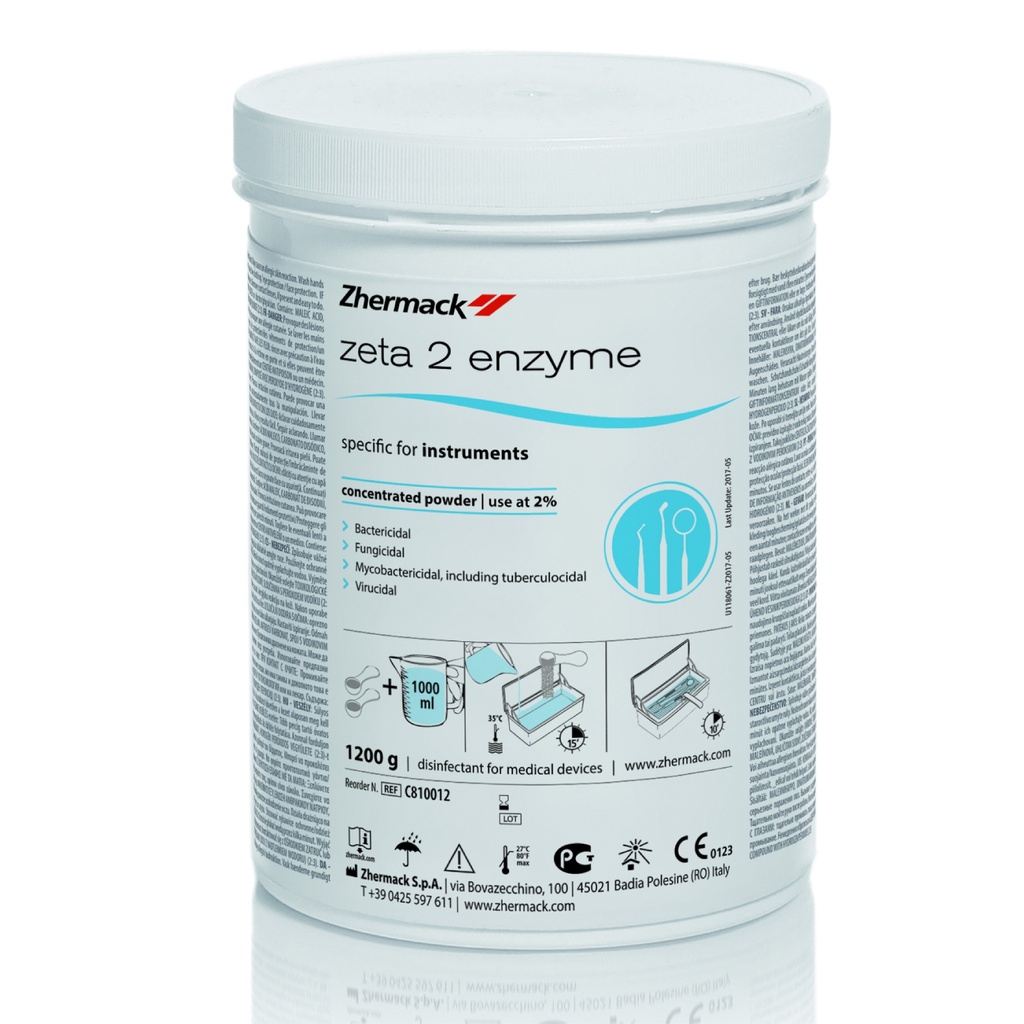 Zeta 2 Enzyme es un desinfectante y detergente trienzimático en polvo específico para instrumentos quirúrgicos y fresas.
